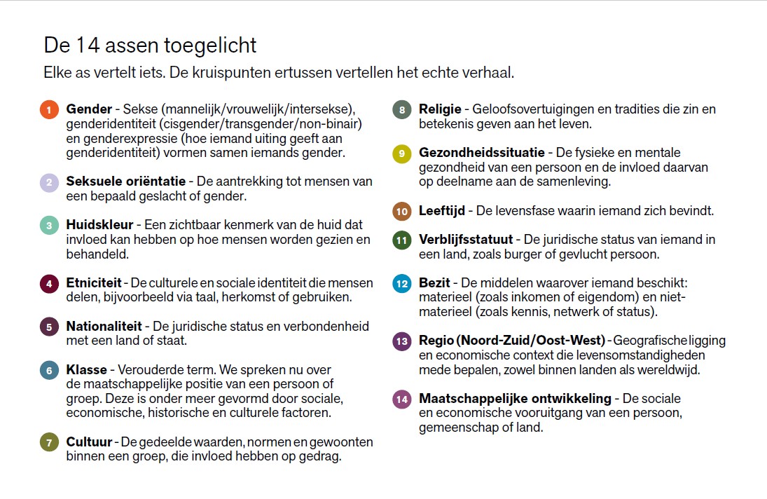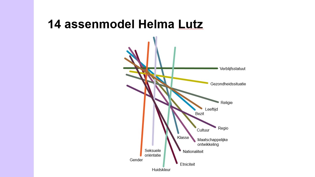 Iedereen heeft een eigen identiteit. Die bestaat uit verschillende kenmerken: leeftijd, gezondheid, regio, inkomen, gender, cultuur, huidskleur, bezit, verblijfsstatus, seksuele oriëntatie, maatschappelijke positie, nationaliteit, religie en etniciteit. Deze 14 assen van identiteitsvorming van socioloog Helma Lutz helpen om dit te zien en begrijpen.